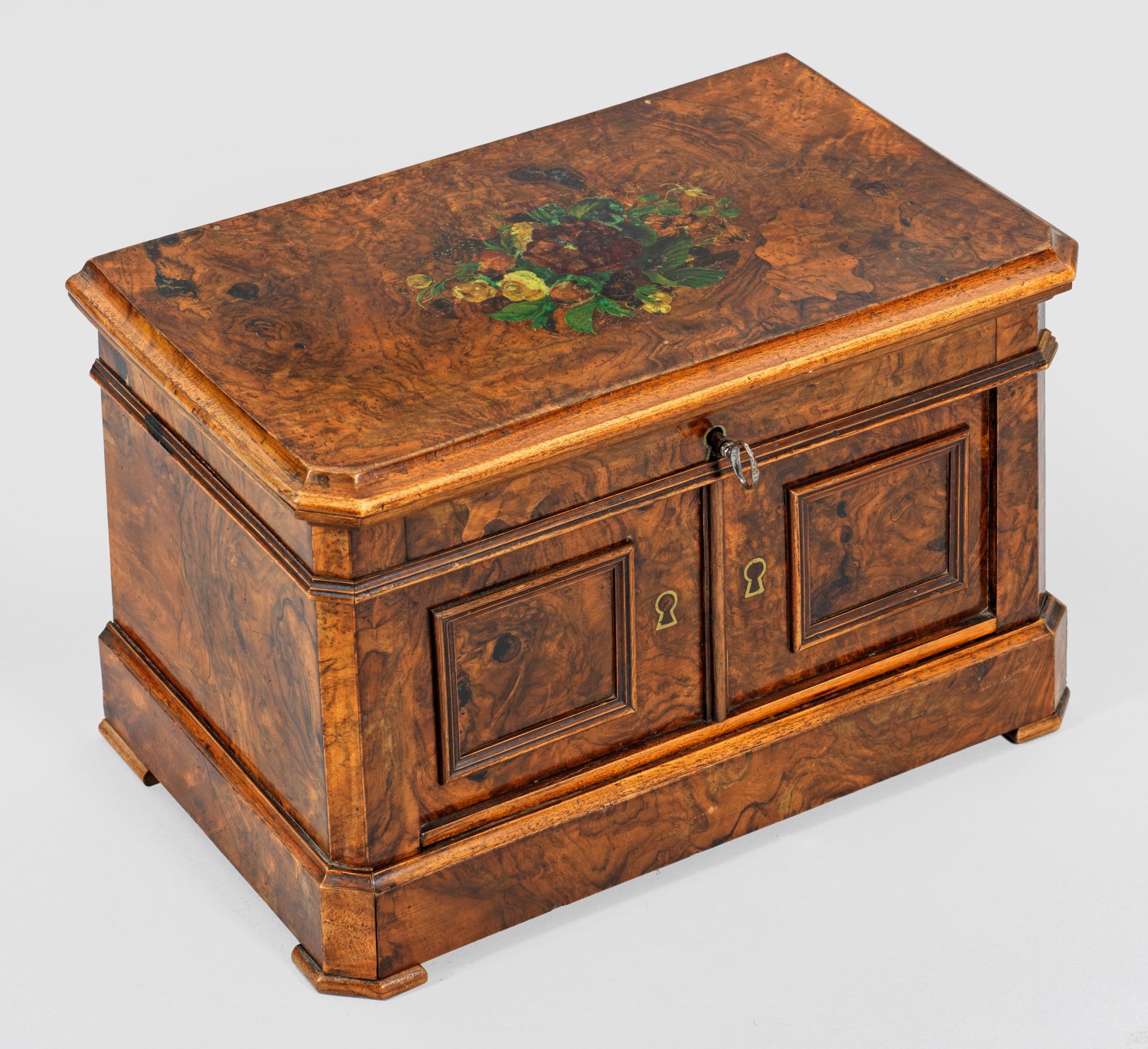 Nussbaummmaser, furniert sowie teilw. polychrom dekoriert. Gerader, querrechteckig angelegter Korpus, flankiert von schräggestellten Ecklisenen auf einschübigem Zargensockel. In der gegliederten Front zwei Blendtüren. Profilierter, aufklappbarer Flachdeckel. Unterhalb eingelassene Spiegelfläche, herausnehmbare Inneneinteilung sowie zwei Geheimschubladen. Besitzeretikett. "Baumeister Adolf Krauss Bückeburg". H. 24 cm. 37 cm x 21 cm.