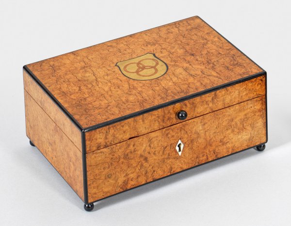 Wurzelnuss, furniert sowie Einlagen aus unterschiedlichen, teilw. gefärbten Edelhölzern. Querrechteckig angelegter Korpus auf kleinen Kugelfüßen. Dem Korpus entsprechender Deckel mit zentral eingelegtem Wappen von Steele bei Essen sowie unterhalb dat. 1915. H. 10 cm. 22 cm x 16 cm.