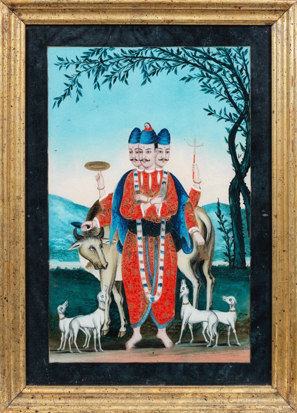 Stilisierte Darstellung eines meerarmigen, dreiköpfigen Mannes, prächtig kostümiert, mit göttlichen Insignien wie Muschelhorn, Shivas Dreizack und Wurfscheibe inmitten von Hunden und Wasserbüffel in offener Landschaft dargestellt. Feine Hinterglasmalerei mit partiellen Goldhöhungen. Holzrahmen. 56 cm x 41 cm.