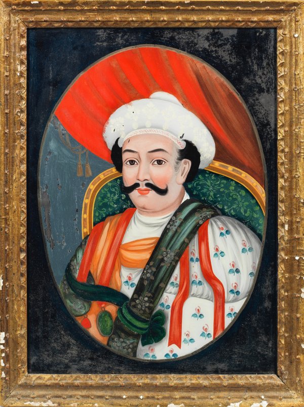 An Indian reverse painting on glass with a depiction of a fashionably dressed ruler in front of a curtain. Gold embellishments. Partly rubbed. Framed.