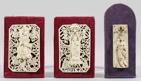 Elfenbein, reliefplastisch geschnitzt. Die Buchdeckelapplikationen in feiner Ajourarbeit. Hierbei Christus auf einem Palmettensockel in einer Bogennische stehend, aufgelegt auf Rankenwerk mit figürlichen Darstellungen sowie eine, die Leidenswerkzeuge Christi präsentierende Figurengruppe, aufgelegt auf korrespondierendem Rankenwerk mit den Allegorien der vier Evangelien. Dazu in qualitätvoller Schnitzarbeit die reliefplastische Wiedergabe der Muttergottes, das Christuskind auf den Armen tragend und in einem gotischen Architekturelement stehend. Jeweils montiert auf mit Samt bezogenen Holzplatten. Teils Risse. H. 9 - 12,3 cm, B. 4,5 - 14 cm.
