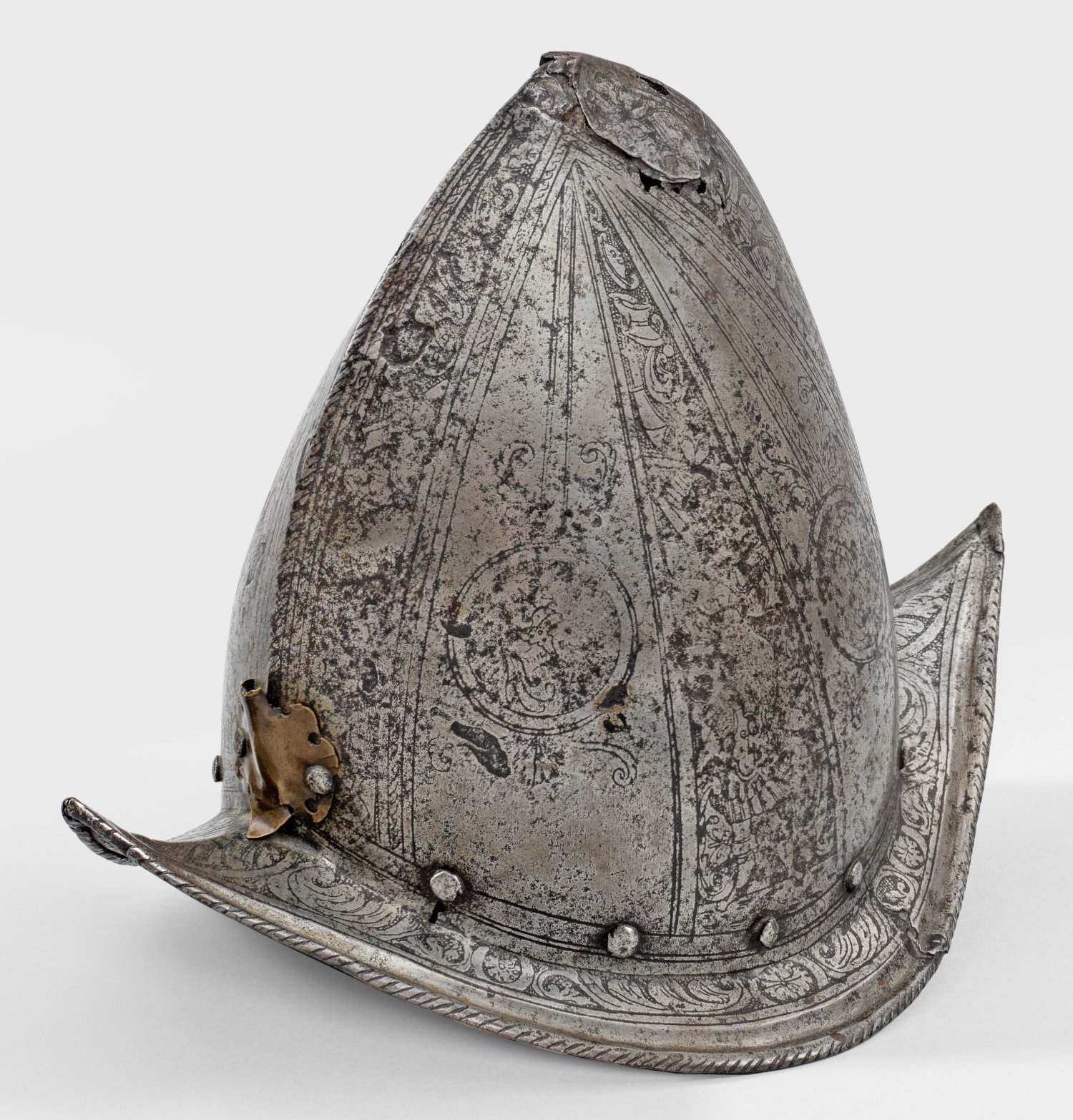Eisen, geätzt. Einteilig geschlagene, konische Kalotte mit hohem Kamm und an den Seiten schräg nach unten abfallender Krempe mit gebördeltem Rand, beidseitig spitz zulaufend. Umlaufende Futternieten. Aufwändiger Ätzdekor mit Porträtmedaillons, gerahmt von Bändern mit Blattranken und teilw. undeutlichen, szenischen Darstellungen. Vernietete Federbuschtülle aus Messing. Teilw. besch.; H. 26,5 cm. 35,5 cm x 24 cm.