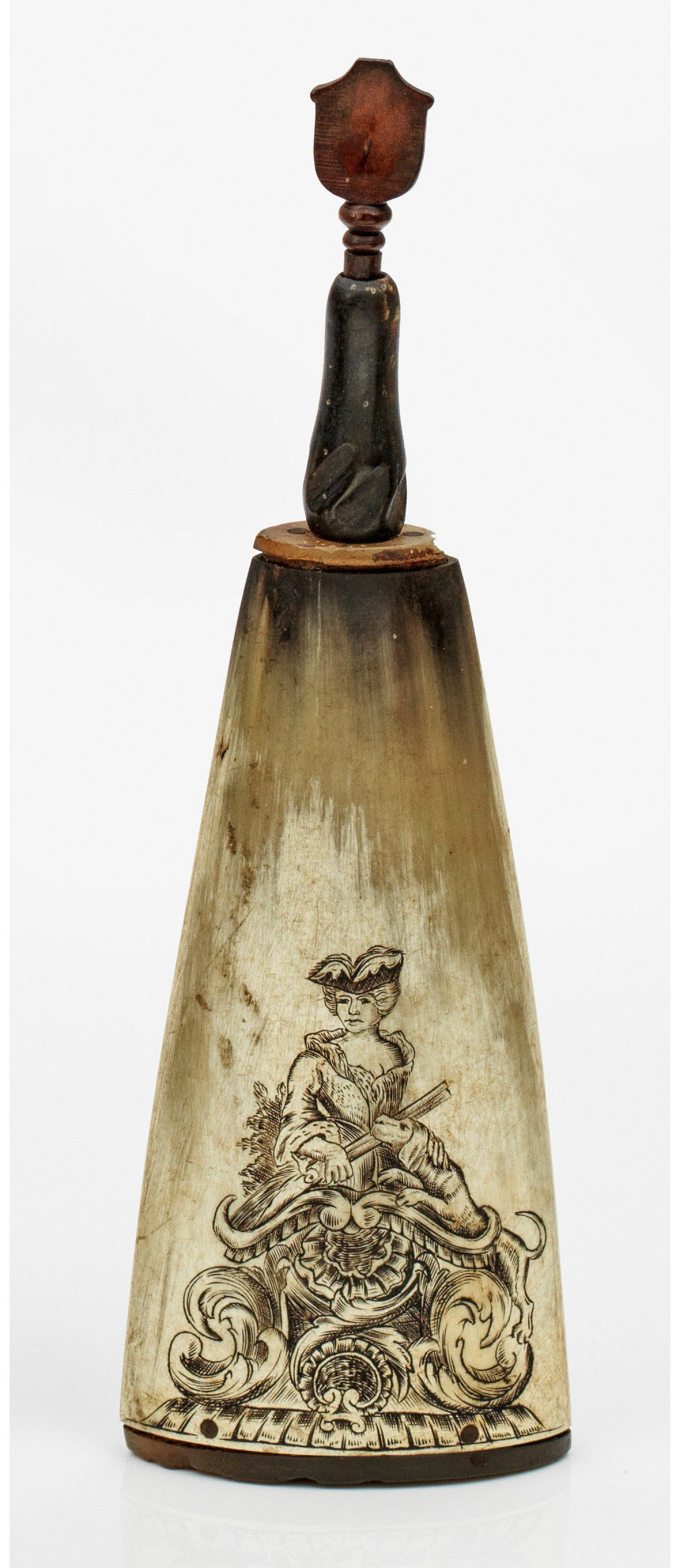 Horn und Holz. Abgeflachter, spitz zulaufender Korpus aus genietetem Rinderhorn. Balusterförmige Schütte mit Holzstopfen in Kartuschenform. Schauseitig über fein graviertem und geschwärztem Muschelwerk und üppig volutiertem Akanthusblatt die Darstellung einer Jägerin mit Hut, eine Flinte haltend. Neben ihr ein springender Jagdhund. Minim. best.; H. 21,5 cm. 6,5 cm x 3 cm.