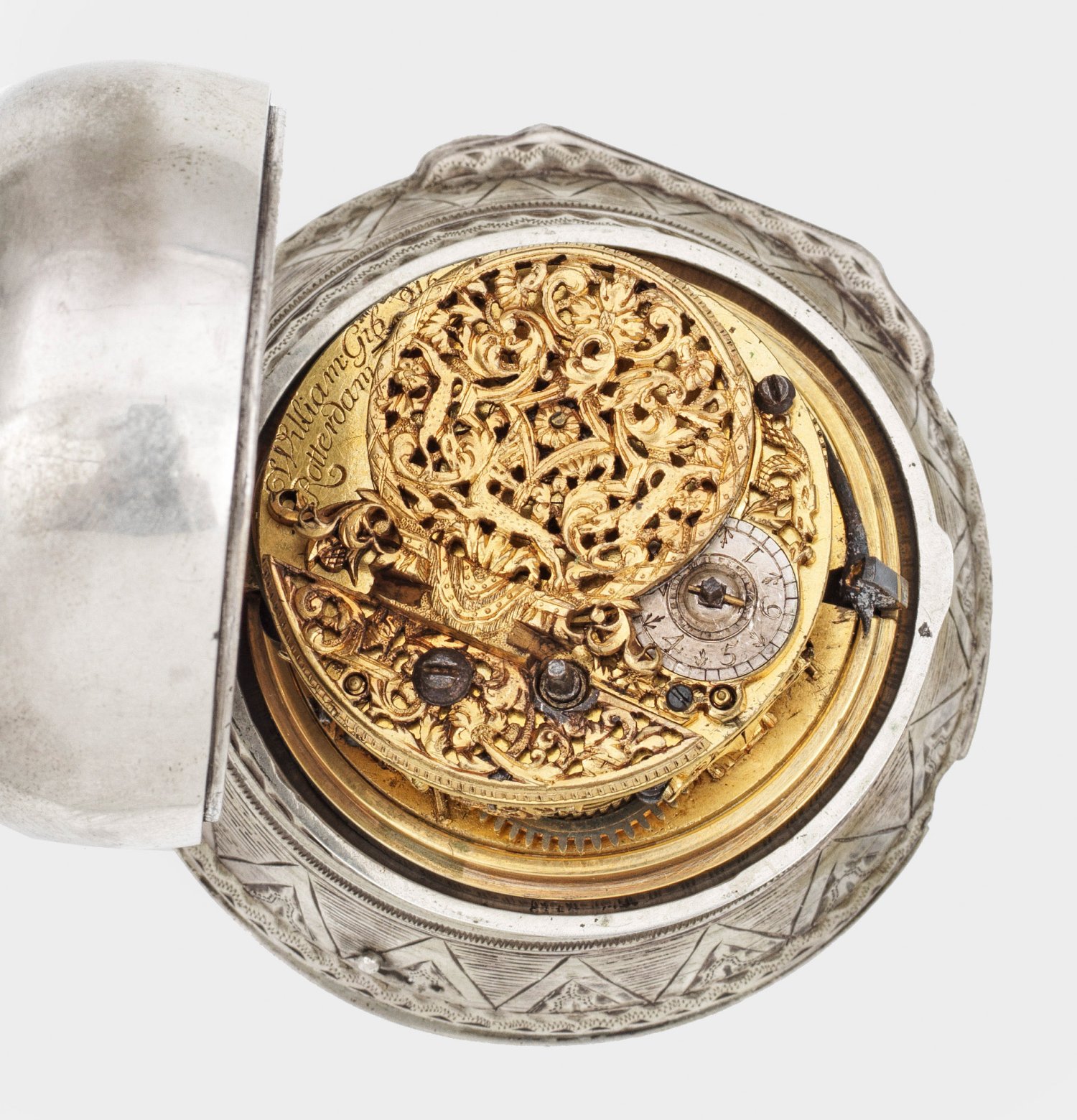 A rare four cased verge watch by William Gib, Rotterdam, circa 1700. Silver. Gilt mechanical movement. Dial and platine signed and with no. 216. Minor repairs.
