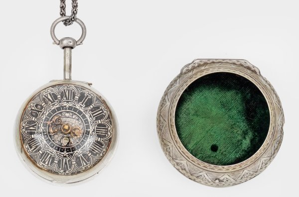 Niederlande. Rotterdam. Um 1700; Silber. Aufsteigendes Außengehäuse mit getriebenem, vegetabilem Dekor, zentral besetzt mit grünem Glasstein. Das zweite Gehäuse mit grün-braunem Schildpatt überzogen, akzentuiert durch Silbernägel. Das dritte Gehäuse graviert mit ornamental-geometrischem Dekor. Das glatt polierte Innengehäuse mit Länder-/Stadtpunze von London, Jahresbuchstabe (verschlagen) und Meisterpunze des Gehäusemachers "IR". Champlevé-Zifferblatt mit römischen Indexen, signiertem und figurativ dekoriertem Zentrum sowie einem geschwungenen Zeiger. Vergoldetes Vollplatinenwerk mit Spindelhemmung, dreiarmiger Stahlunruh und Schlüsselaufzug über Trommel, Darmsaite und Schnecke. Platine sign. und nummeriert 216. Dazu: lange Silberkette mit zwei Schlüsseln. Minim. rep.; D. 5,5 - 9 cm. Ges.-Gew. ca. 542,2 g.
