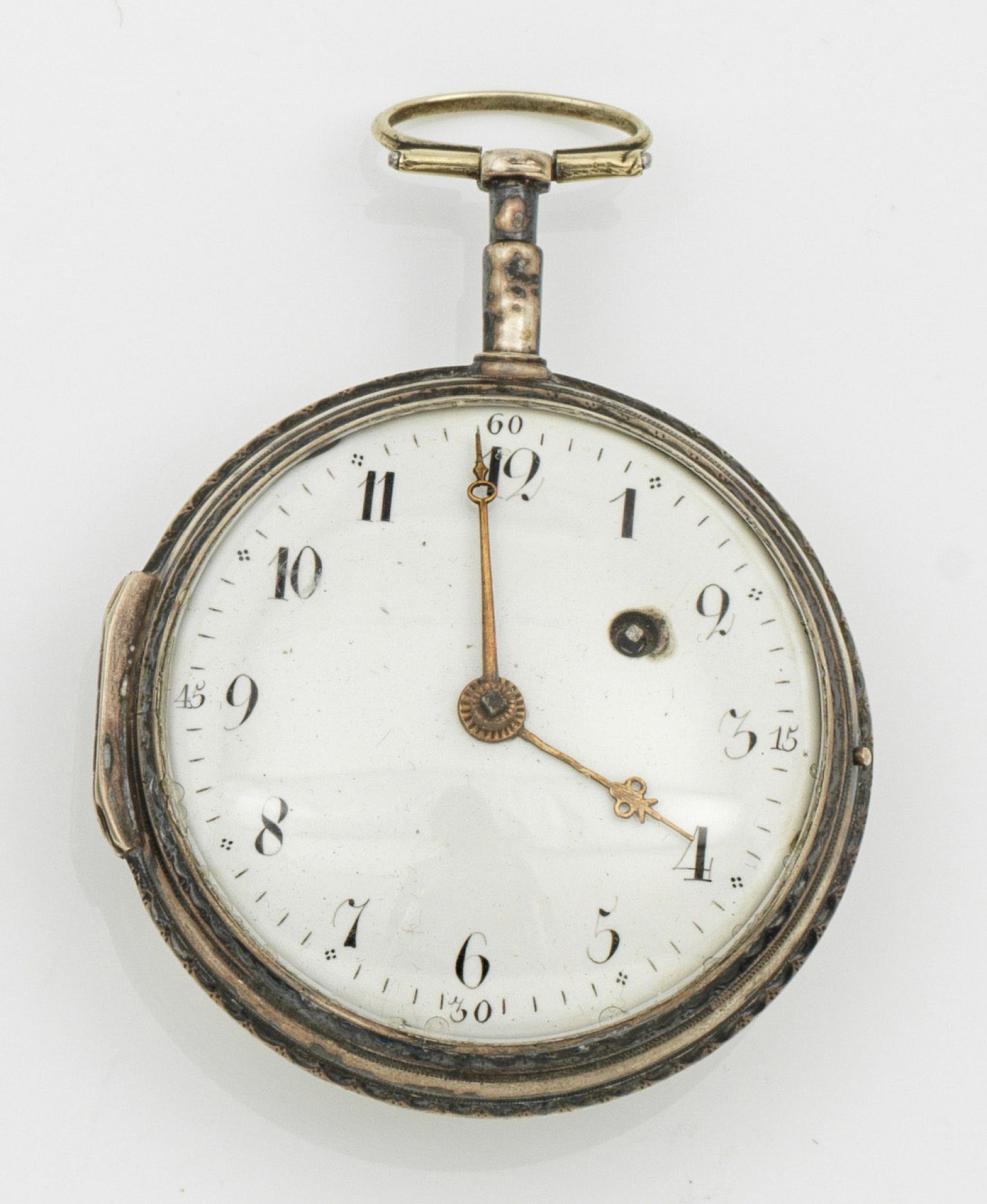 Wohl Frankreich. Um 1800. Silber. Glattes Gehäuse m. Nr. 989 und Gehäusemacherpunze (verschlagen). Weißes Emailzifferblatt mit arabischen Indexen und vergoldeten Zeigern, Schlüsselaufzug auf "2". Vergoldetes Vollplatinenwerk mit Spindelhemmung, dreiarmiger Unruh und Aufzug über Trommel, Kette und Schnecke. Minim. besch./rep.; Gew. ca. 93,3 g. D. ca. 5,4 cm.