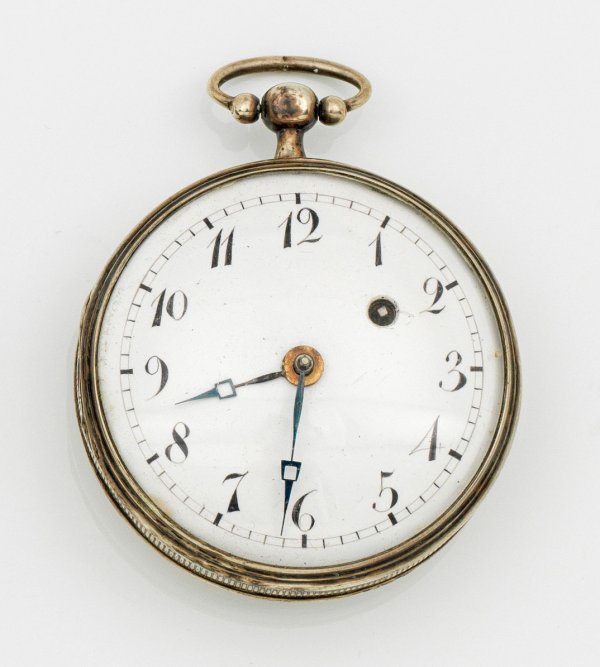 Frankreich. Paris. 1809 - 1819. Silber. Glattes Gehäuse, gest. mit Pariser Beschaumarken und Gehäusemacherpunze AL. Weißes Emailzifferblatt mit arabischen Indexen und gebläuten Zeigern. Vergoldetes Vollplatinenwerk mit Spindelhemmung und dreiarmiger Messingunruh, Aufzug über Trommel, Kette und Schnecke. Werkschutzkappe sign.; Ges.-Gew. ca. 102 g. D. ca. 5,1 cm.