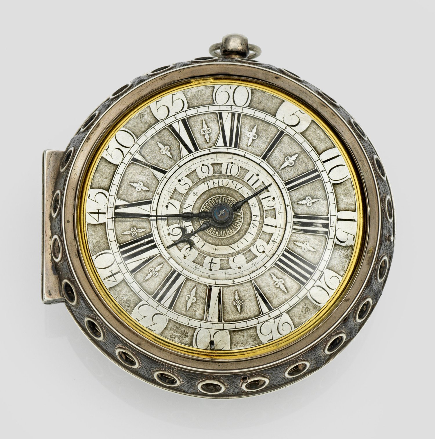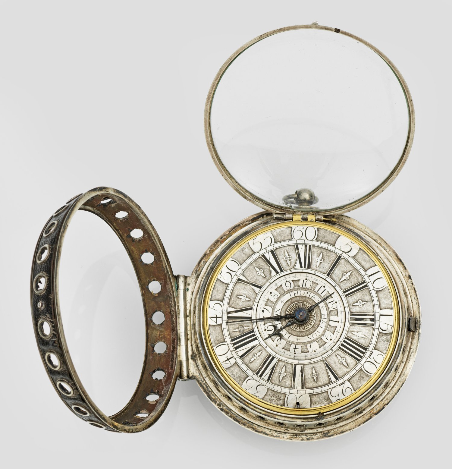 England. London. 1757 - 1774; Metall und Silber, teilw. vergoldet. Ringförmig durchbrochenes Gehäuse mit aufgelegtem schwarzem Chagrinleder und Bodenglocke, rückseitiger Mechanismus zur Abdeckung der Aufzugöffnungen. Champlevé-Zifferblatt mit römischen Indexen und arabischer Minuterie, 'Poker- und Beetle'-Zeigern und zentraler, sign. Weckerscheibe mit arabischen Ziffern. Vergoldetes Vollplatinenwerk mit feiner Rankenornamentik in Ajour, Spindelhemmung, dreiarmiger Stahlunruh, 3 Hämmern auf Bodenglocke und Schlüsselaufzug. Platine sign. und mit Nr. 469. Ges.-Gew. ca. 1044,2 g. D. ca. 11 cm.
