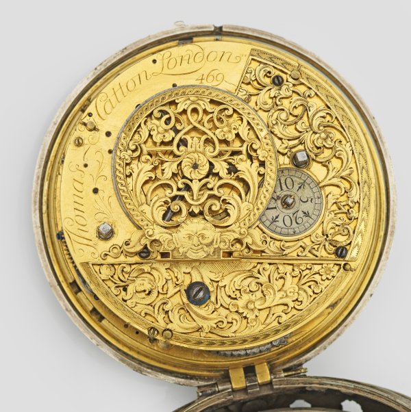 A rare verge alarm watch by Thomas Hatton, act. 1757 - 1774 in London. Case in metal, encased with black shagreen leather. Dial in silver. Gilt mechanical movement with key wind, signed and numbered 469.