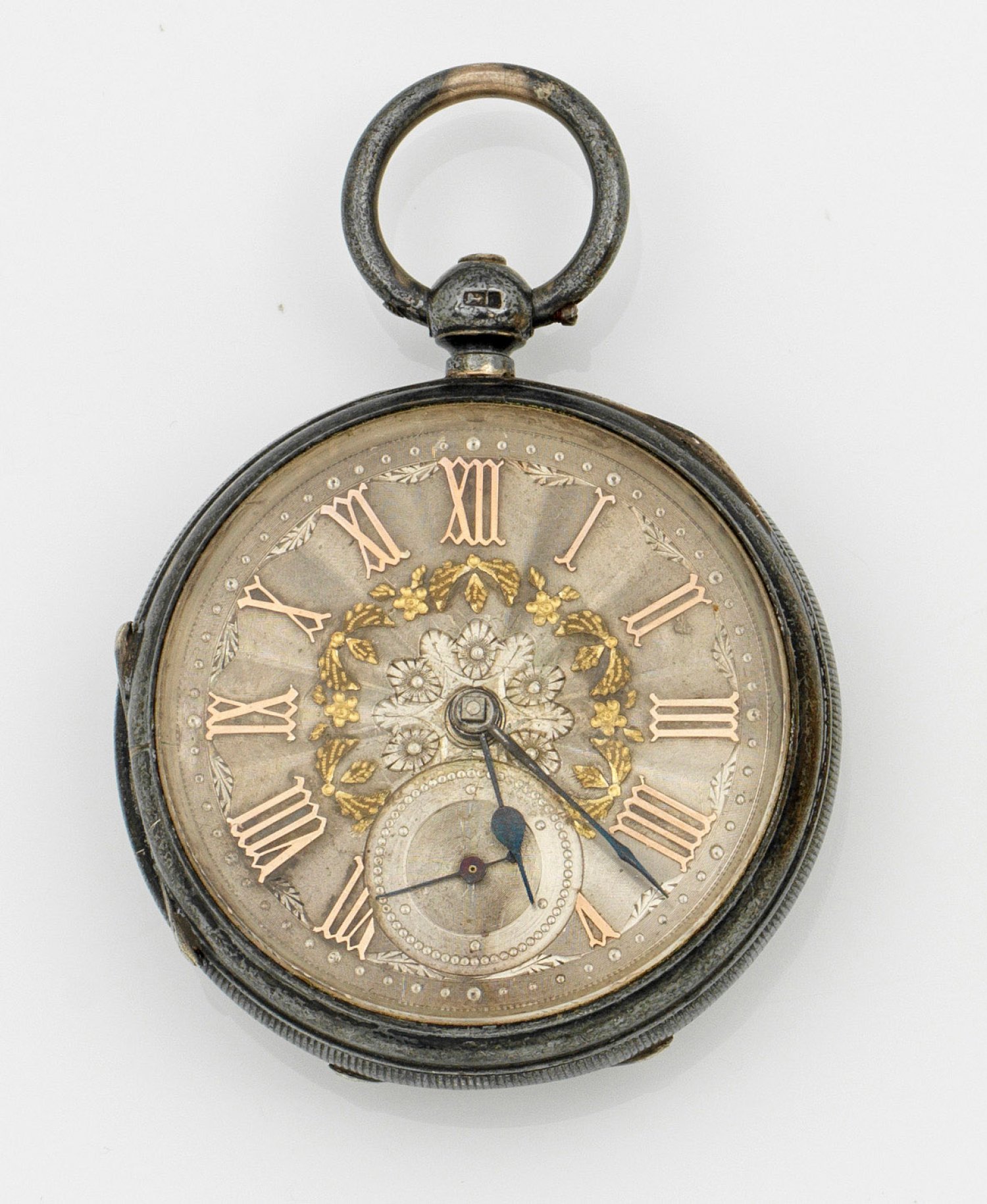 England. Chester. 1881. Sterling Silber, gest. mit Länder-/Stadtpunze, Jahresbuchstabe und Gehäusemacherpunze von Samuel Jackson (reg. 1871). Guillochiertes Gehäuse mit graviertem Wappenschild. Glatte Silbercuvette. Guillochiertes Zifferblatt mit römischen Indexen, aufgelegtem Girlanden- und vegetabilem Dekor, kleiner Sekunde und birnförmigen Zeigern. Vergoldetes Vollplatinenwerk mit Werkschutzkappe, Ankerhemmung und Schlüsselaufzug über Trommel, Kette und Schnecke. Werk-Nr. 53272. Gew. ca. 129,1 g. D. ca. 5 cm.