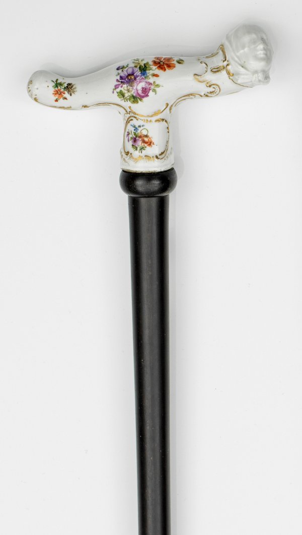 Porzellan auf ebonisiertem Holzschaft mit wulstiger Manschette. Geschweifter, T-förmiger Stockgriff, sog. Krücke. Beidseitig der Wandung sowie auf der Ober- und Unterseite farbige Blumengebinde bzw. gestreute Blüten in polychromer Malerei mit Goldstaffage sowie plastisch ausgeformter, verschleierter Frauenkopf. Vergoldung minim. ber.; L. 96 cm.