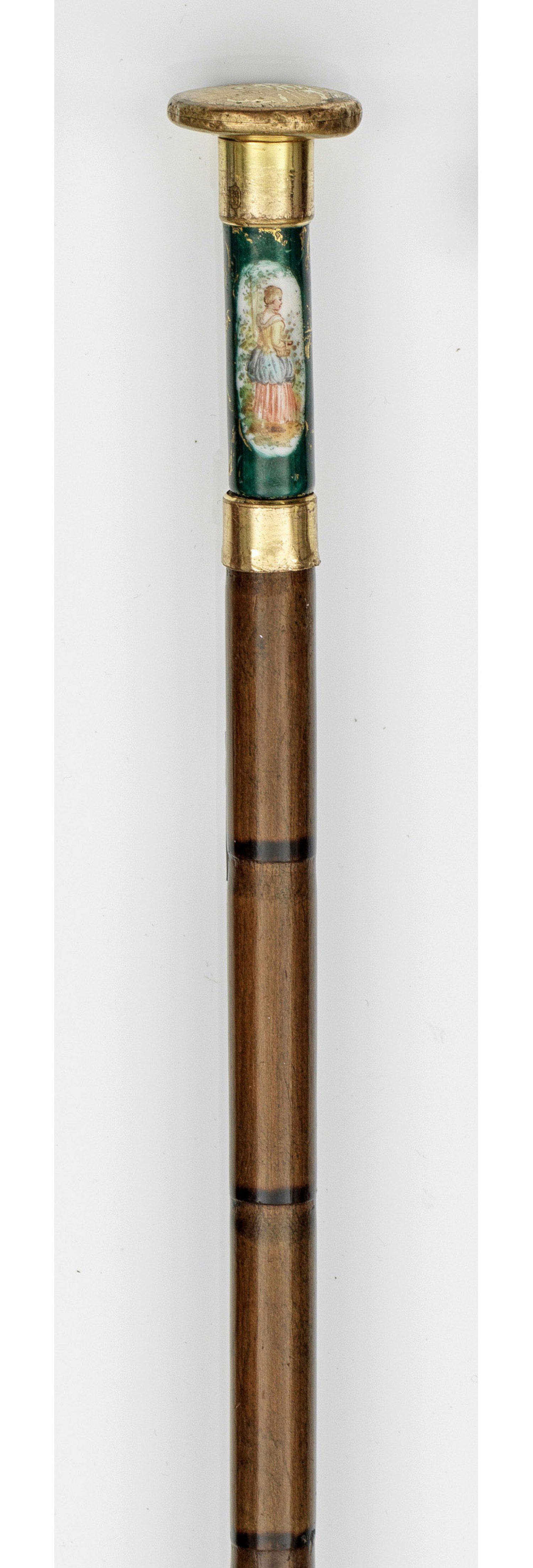 Porzellan und Messingmontierung auf partiell geschwärztem Holzschaft in Bambusoptik. Knaufförmiger, zylindrischer Griff mit höfisch gekleidetem Herrn und Dame in Kartuschen und goldenem Rankwerk. Gest. "ZB"; L. 88 cm.