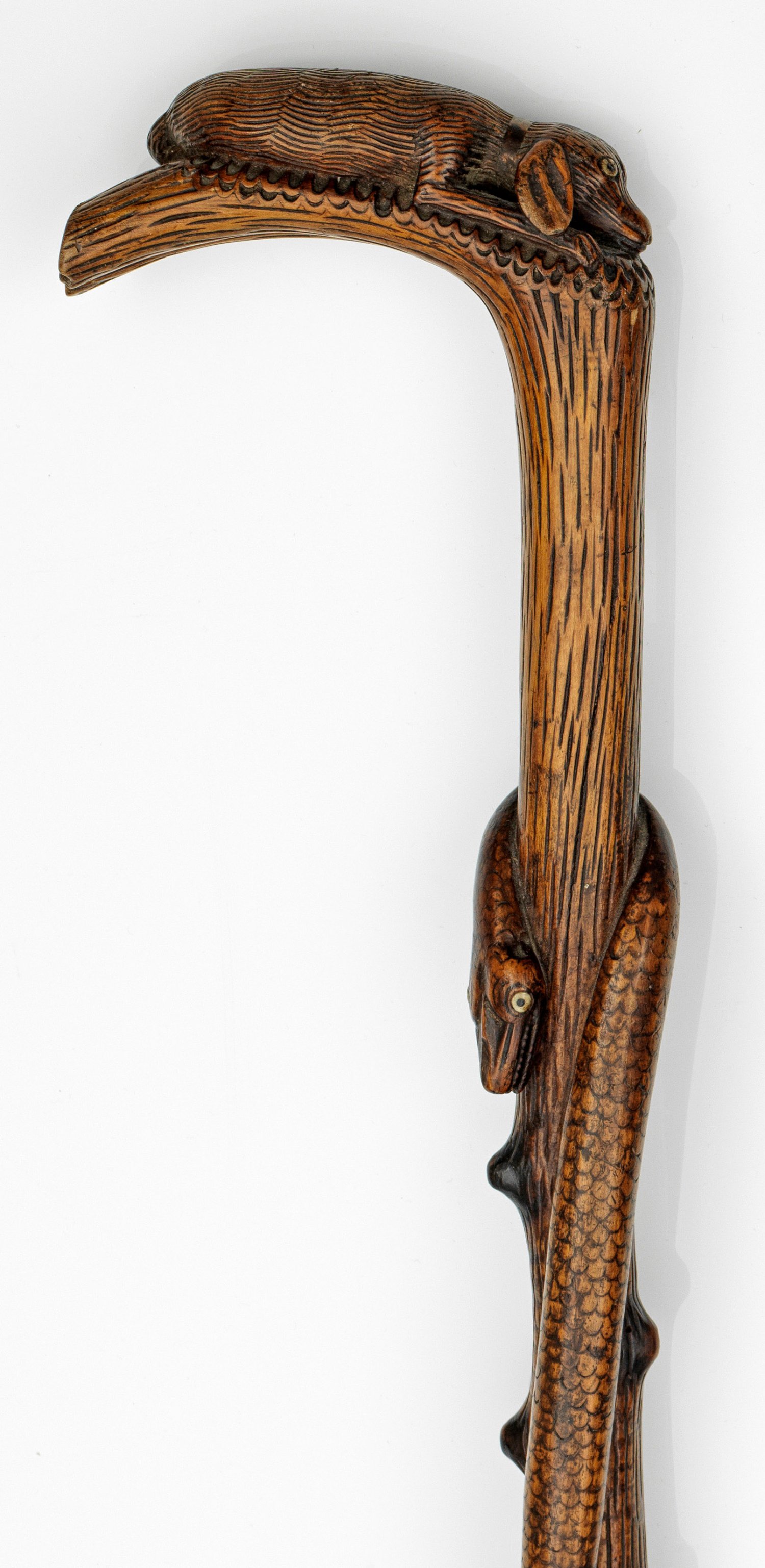 Lackierter Holzschaft mit knorpeligen, teilweise geschwärzten Astansätzen, umschlungen von vollplastisch ausgearbeiteter Schlange. Gerader Hakengriff in Gestalt eines liegenden Hundes. L. 93 cm.