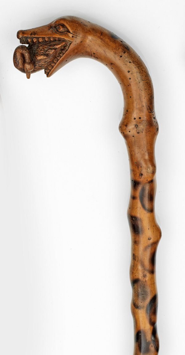 Lackierter Holzschaft mit knorpeligen, teilweise geschwärzten Astansätzen. Vollplastisch ausgearbeiteter, hakenförmiger Griff in Gestalt eines Schlangenkopfes, einen Schwan verschlingend. L. 94 cm.