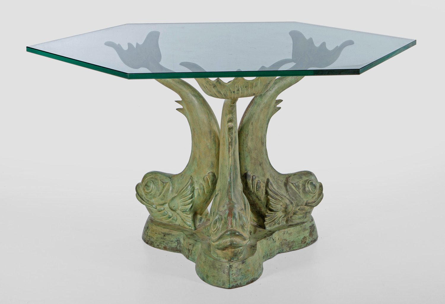 Bronze, grün patiniert und farbloses Glas. Korpus aus drei vollplastisch gestalteten, gegeneinandergestellten Delfinen als Träger für hexagonale Deckplatte. H. 77 cm. 120 cm x 137 cm.