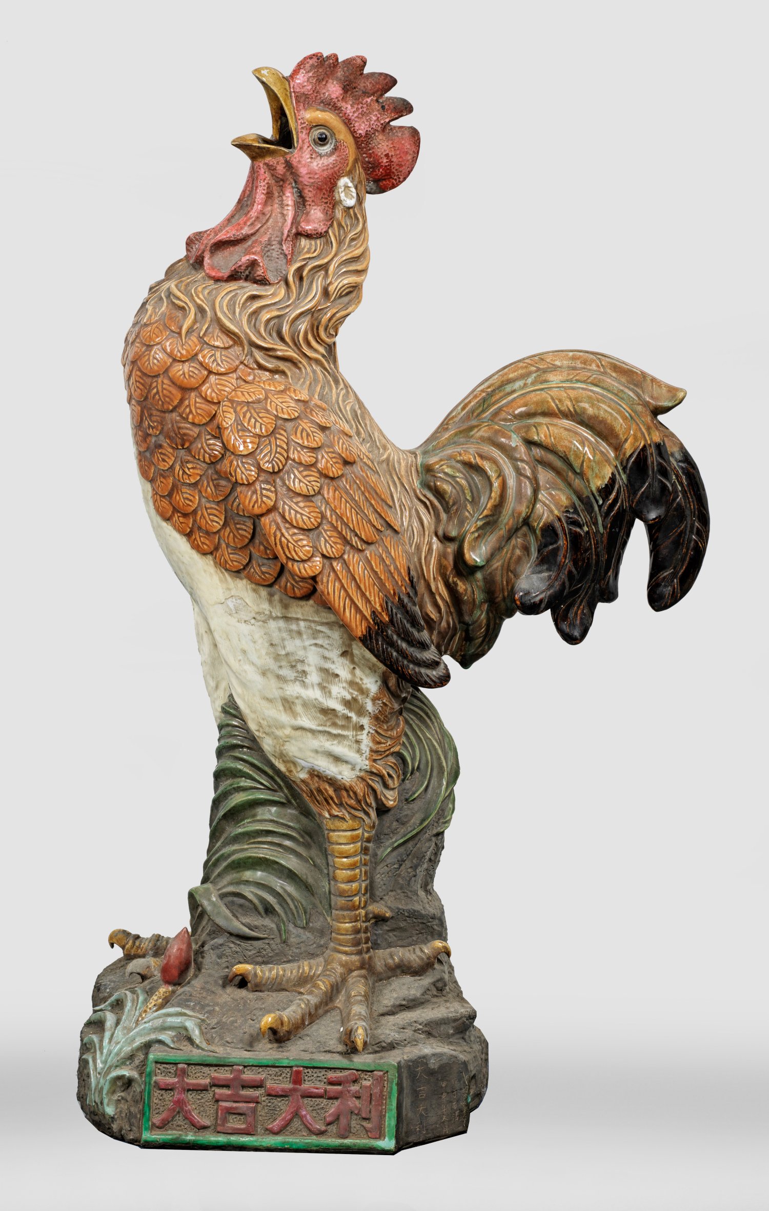 Keramik, farbig glasiert und staffiert. Auf naturalistisch gestaltetem Sockel mit Blüte und Schilfpflanzen die vollplastische, realistische und farbenfrohe Darstellung eines krähenden Hahnes mit detailliert gestaltetem Gefieder. Auf dem Sockel eine rechteckige Kartusche mit chinesischen Schriftzeichen. H. 98 cm. 35 cm x 31 cm.