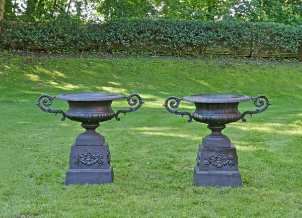 A pair of French black lacquered cast iron garden vases with pedestal.