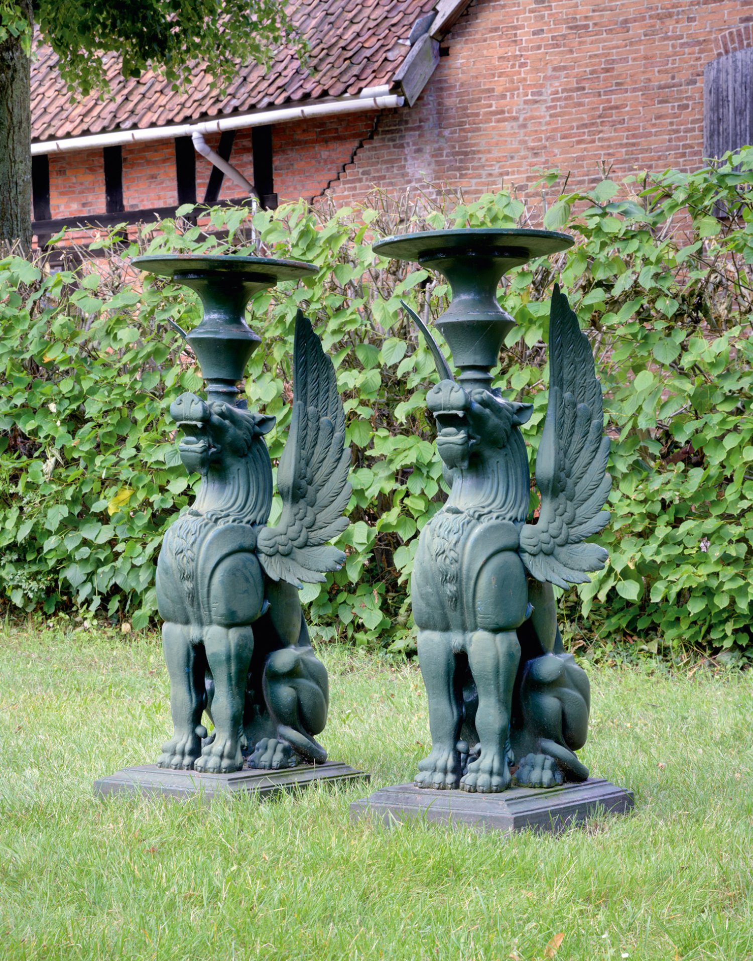 A pair of large French dark green painted cast iron Napoleon III gueridons depicting winged lions as guard figures.
