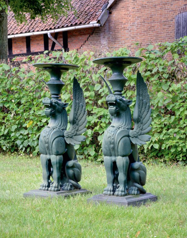 Gusseisen, dunkelgrün lackiert. Über rechteckiger, umlaufend gekehlter Plinthe vollplastisch ausgeführte und stilisiert dargestellte sitzende, geflügelte Löwenskulpturen als Fächterfiguren, einen kräftigen, mehrfach gegliederten Balusterschaft auf ihrem Kopf balancierend. Oberhalb flache, runde Deckplatte als Abstellfläche. Sockel bez. Salin France. H. 118 cm. D. 40 cm.