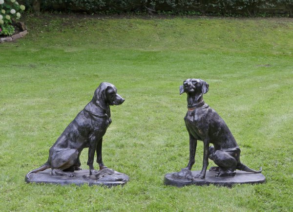 Gegenstücke. Gusseisen. Länglich-ovale Plinthe, auf ihren Hinterläufen sitzende, vollplastische, naturgetreu geschilderte Hunde mit stolz erhobenem bzw. leicht gesenktem, zur Seite blickendem Kopf, vor ihnen ein erlegter Wildvogel und ein Jagdutensil. H. ca. 88 cm.