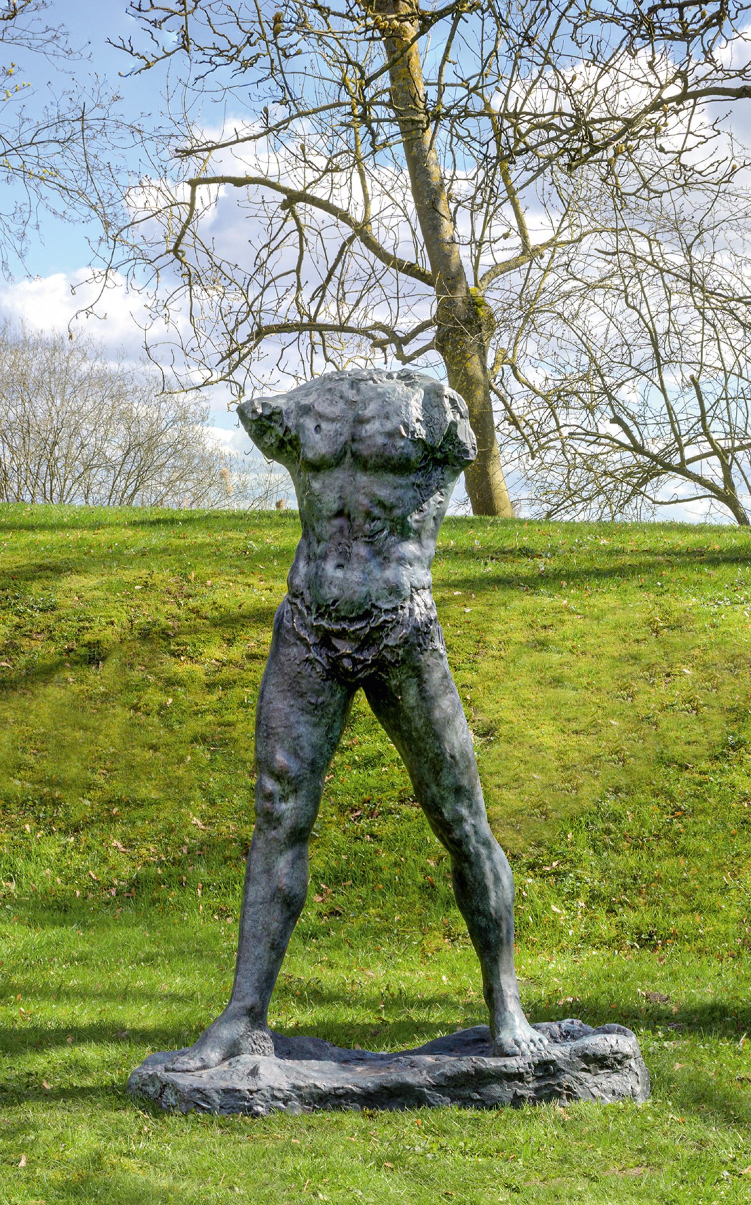 Bronze, patiniert. Bez.; Posthumer, zeitgenössischer Guss, Ende 20./Anfang 21. Jh.; Das Torso-Motiv des "Schreitenden Mannes" beschäftigte Rodin über einen Zeitraum von 30 Jahren - 1877/78 und 1899 bis 1907 schuf er eine Reihe unterschiedlicher Versionen. Dargestellt ist ein männlicher, kopf- und armloser Torso in breiter, leicht seitlicher Schrittstellung auf einer unregelmäßigen, länglichen Plinthe; die Oberfläche der Plastik ist in der für Rodin typischen Weise lebendig bewegt, wodurch ein reiches Licht- und Schattenspiel entsteht. Vor Rodin verstand man darunter meist eine unvollständig erhaltene, antike Statue. Die römischen Torsi und diejenigen Michelangelos, welche Rodin 1875/76 auf seiner Italien-Reise sah, inspirierten ihn jedoch, die Unvollständigkeit zu einem bewussten Gestaltungsmittel zu machen. Durch die Reduktion gelang es Rodin, das Motiv des Schreitens in künstlerisch konzentrierter, dynamisch verdichteter Weise zum Ausdruck zu bringen. Hierdurch prägte er einen ganz neuen, autonomen Stil, womit er wegweisend für die moderne Plastik und Skulptur des 20. Jhs., u. a. für Alberto Giacometti, war. H. 158 cm.