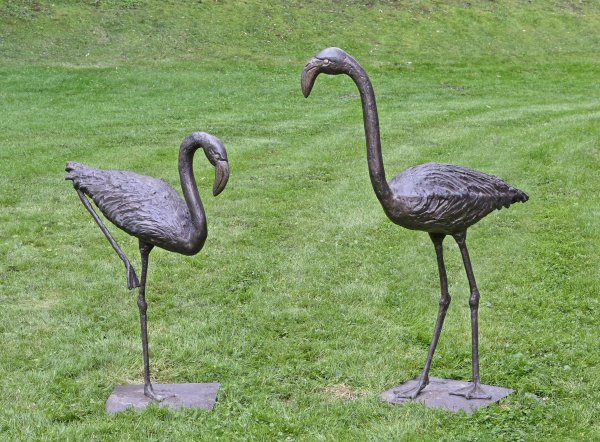 Bronze, patiniert. Große, vollplastisch gestaltete Flamingos mit langen, teilw. angewinkelten Beinen und naturalistisch reliefiertem Gefieder. H. 99,5 cm - 127 cm.