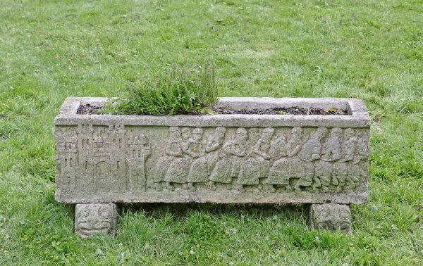 Cremefarbener Sandsteinguss. Schmaler, querrechteckig angelegter Korpus auf gekanteten Podesten mit reliefplastischen Maskarons. In der Front erhaben reliefierter Fries aus stilisierter Burgarchitektur und vielfiguriger Ritterschaft. H. 40 cm. 100 cm x 28 cm.