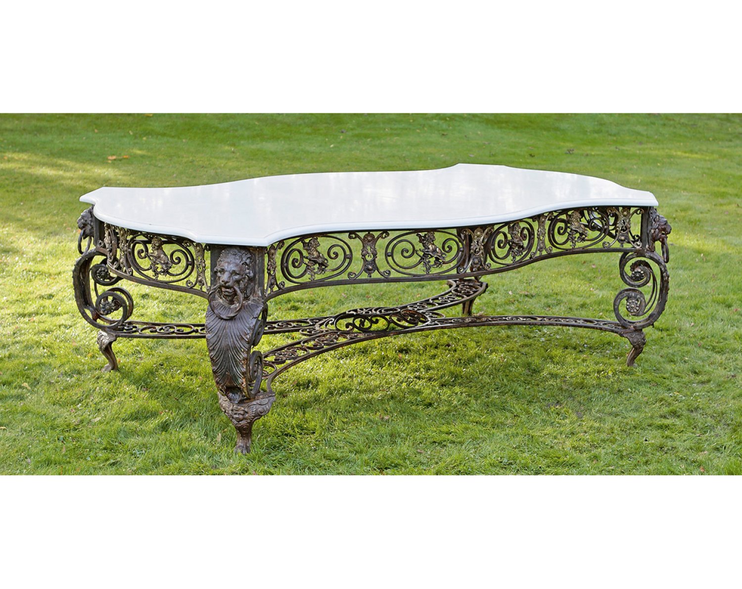 Schmiedeeisen und Bronze sowie weißer, hellgrau gemaserter Marmor. Passig geschweifte, durchbrochen gearbeitete Zarge aus Ovalen mit eingerollten Voluten sowie reliefplastisch gestalteten Löwenfiguren. Auf den schräggestellten Ecken reliefplastisch gestaltete Löwenmaskarons und große Greifringe. Stark geschwungene Beine aus breiten, blattreliefierten und eingerollten Voluten mit applizierten Rosettenmotiven. Dazwischen breite, konkav eingezogen Stege mit korrespondierendem Volutendekor. Gering überstehende, profilierte Deckplatte. H. 84 cm. 260 cm x 148 cm.
