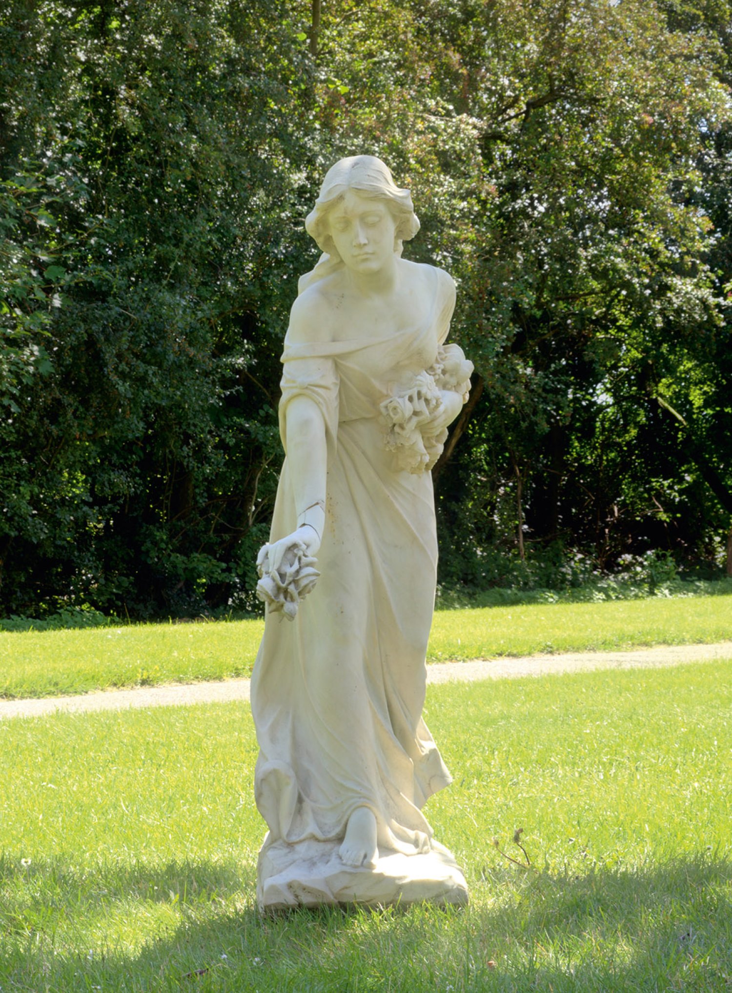 Weißer Marmor. Vollplastisch gearbeitete Statue als Garten- bzw. Parkskulptur des Jugendstils oder Art Nouveau. Auf einer annähernd rechteckigen Plinthe in vorgebeugter, graziöser Pose stehendes Mädchen in einem bodenlangen Kleid, mit den Händen Rosen haltend bzw. streuend. Rechte Hand besch.; H. 139 cm.