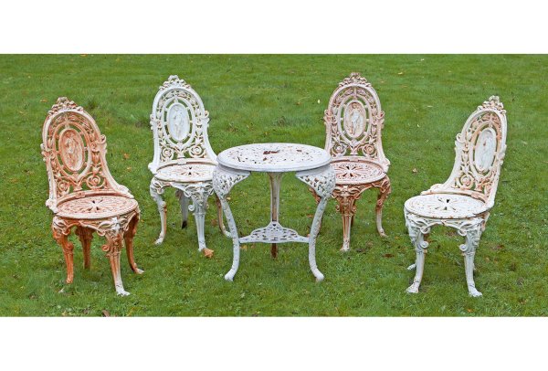 5-tlg.; Tisch und vier Stühle. Gusseisen, weiß lackiert. Stark geschwungene, teilw. durchbrochen gearbeitete Beine als Träger für runde Deckplatte, unterhalb durch Steg verbunden. Stühle aus stark eingezogenen Beinen mit reliefplastisch gestalteten Widderköpfen und rosettenförmiger Sitzfläche. Hochgewölbte Rückenlehne mit großem Medaillonmotiv. Tisch-H. 66 cm. D. 57 cm. Sitz-H. 41 cm.