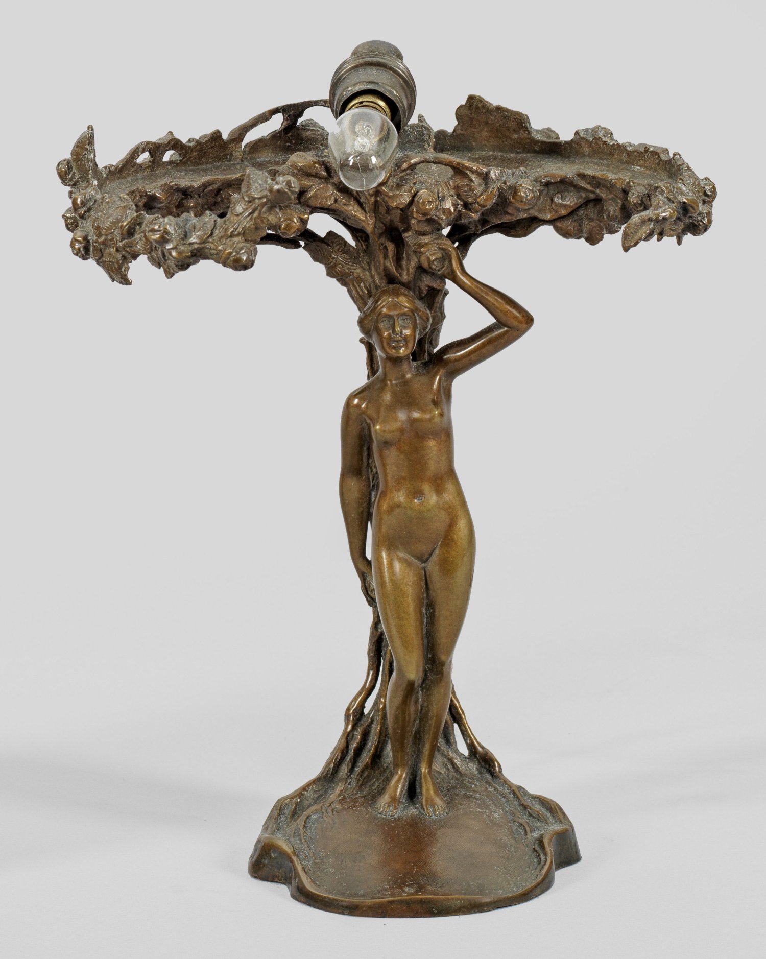 1.flg.; Bronze, braun patiniert., Sign. "Prof. Rudolf Marschall". Um 1905-1910 entstandenes Objekt des Bildhauers, der an der Wiener Akademie bei Josef Tautenhayn studierte und dort seit 1904 selbst als Professor lehrte. Die Tischlampen Marschalls erhielten vornehmlich fragile Stoffschirme, oft aus Seide und daher leicht verlorengingen. Alt elekrifiziert. Ges.-H. 26,5 cm.