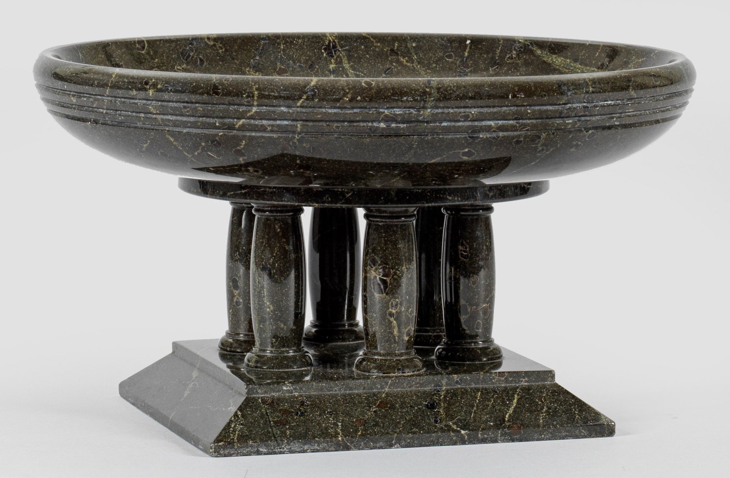 Grau-grün gemaserter Serpentin. Über quadratischem, schräg ansteigendem Sockel sechs Vollsäulen mit profilierten Basen und Kapitellen als Träger für runde, flach gemuldete Schale. Unbez.; H. 18 cm. D. 32 cm.