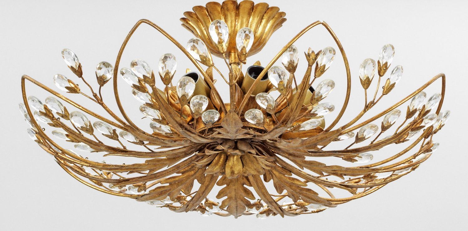 Metall, vergoldet und farbloses Glas. Flacher, kuppelförmiger und durchbrochen gearbeiteter Korpus aus Blattwerk und stilisierten Blütenrispen. Innen acht Lampenfassungen. Elektrifiziert. H. 17 cm. D. 52 cm.