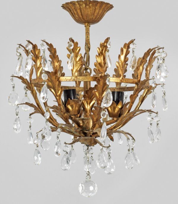 Metall, vergoldet und farbloses Glas. Kuppelförmiger, offen gestalteter Korpus aus gestreckten Blättern. Reicher Behang aus facettierten Prismen. Innen drei Lampenfassungen. Elektrifiziert. H. 41 cm. D. 34 cm.