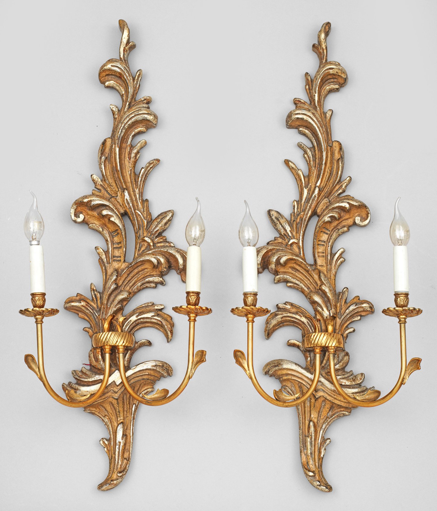 2-flg.; Holz, reliefplastisch geschnitzt, hellbraun gefasst und partiell versilbert sowie Messing. Gestrecktes Wandschild aus üppigem Blattwerk. Davon ausgehend stark geschwungene Leuchterarme mit zylinderförmigen Tüllen über Traufschalen. Elektrifiziert. H. 86 cm.