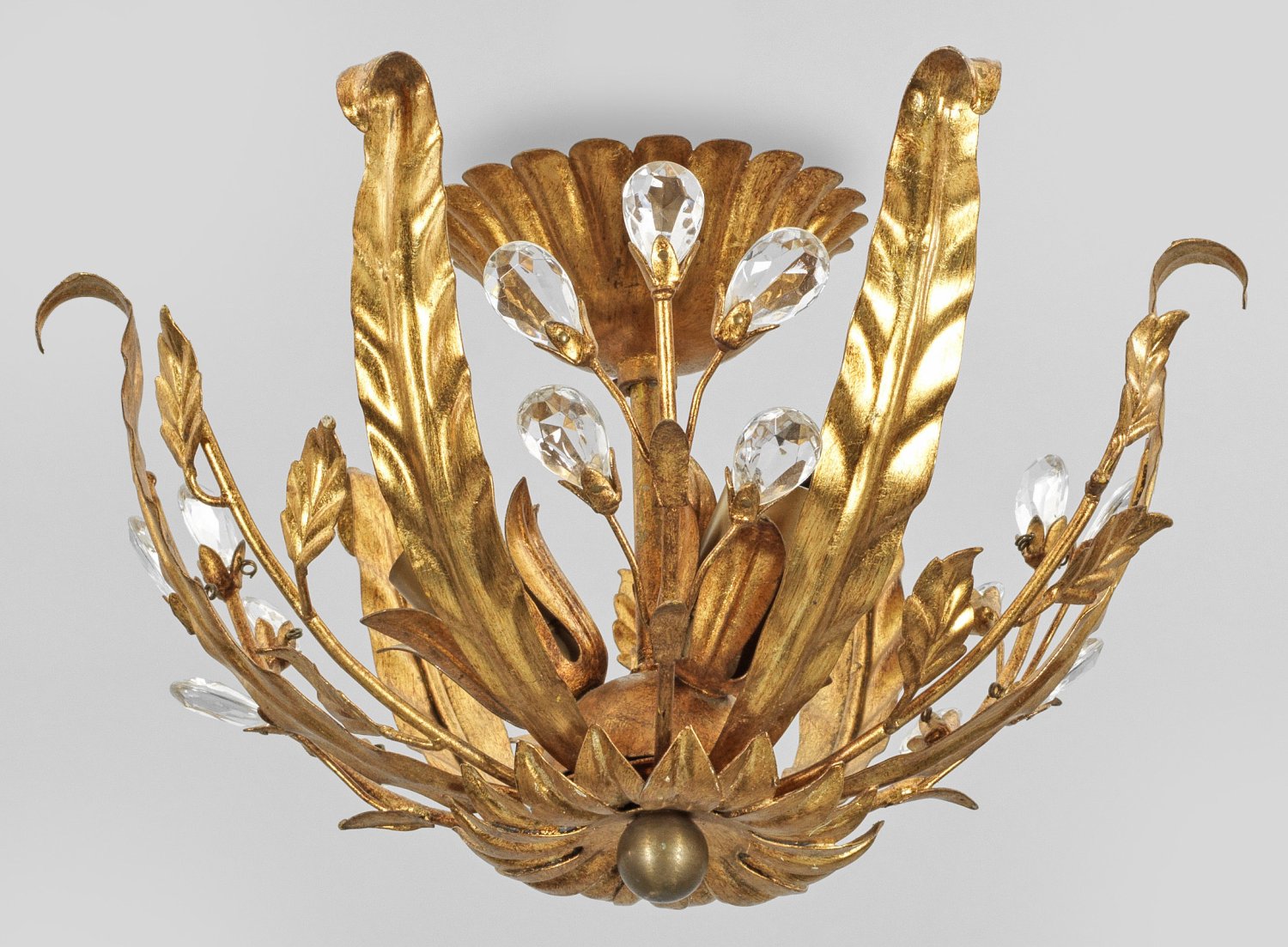 Metall, goldfarben lackiert und farbloses Glas. Offen gestalteter Korpus aus gestreckten Blättern sowie stilisierten Blütenrispen aus facettierten Prismen. Innen drei Lampenfassungen. Elektrifiziert. H. 18 cm. D. 30 cm.