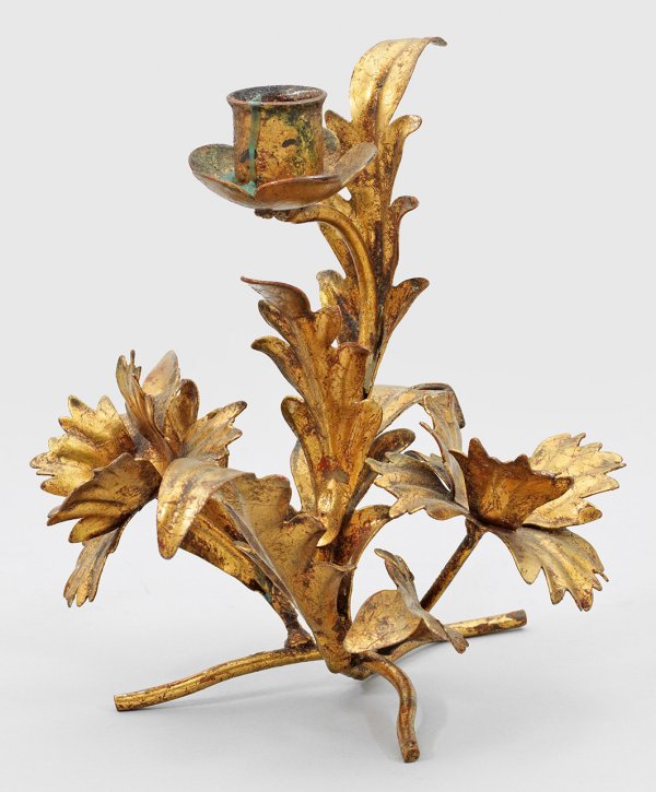 1-flg.; Metall, vergoldet. Korpus aus üppigem Blattwerk und stilisierten Blüten. Zylinderförmige Kerzentülle. H. 19 cm.