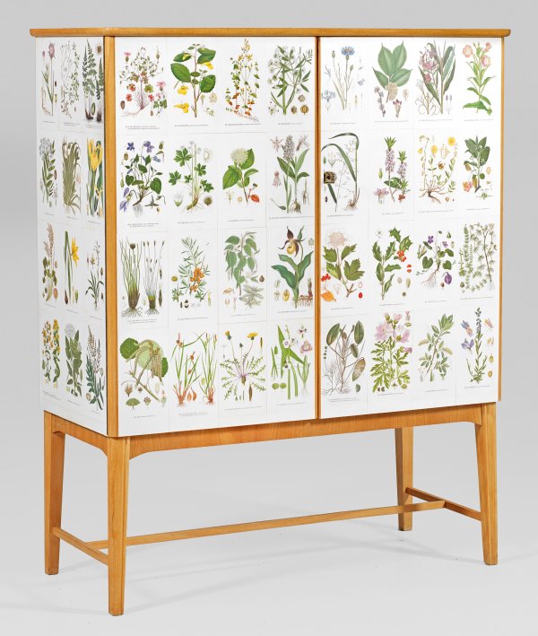 Buchenholz. Gerader, querrechteckig angelegter, zweitüriger Korpus auf hohen, konischen Beinen, unterhalb durch schmale Stege verbunden. Gering überstehende Deckplatte. Dreiseitig flächendeckender Dekor mit Papierillustrationen aus "Bilder ur Nordens Flora" nach Carl A. Lindman. Innen Ablageflächen sowie Schubfächer. H. 139 cm. 113 cm x 48 cm.