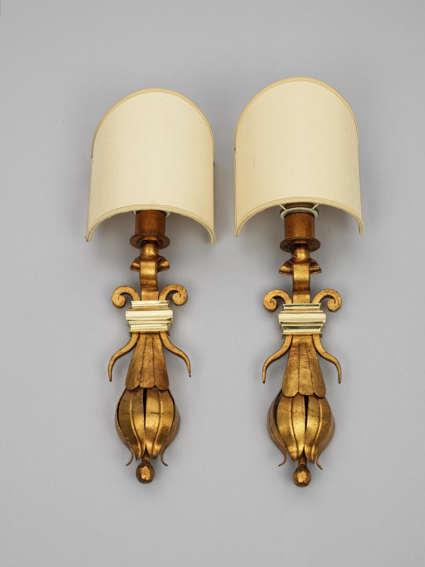 1-flg.; Metall, goldfarben lackiert. Balusterförmiges Wandschild aus Blattwerk und Voluten als Träger für Leuchtmittel mit gewölbtem Lampenschirm. Elektrifiziert. H. 58 cm.
