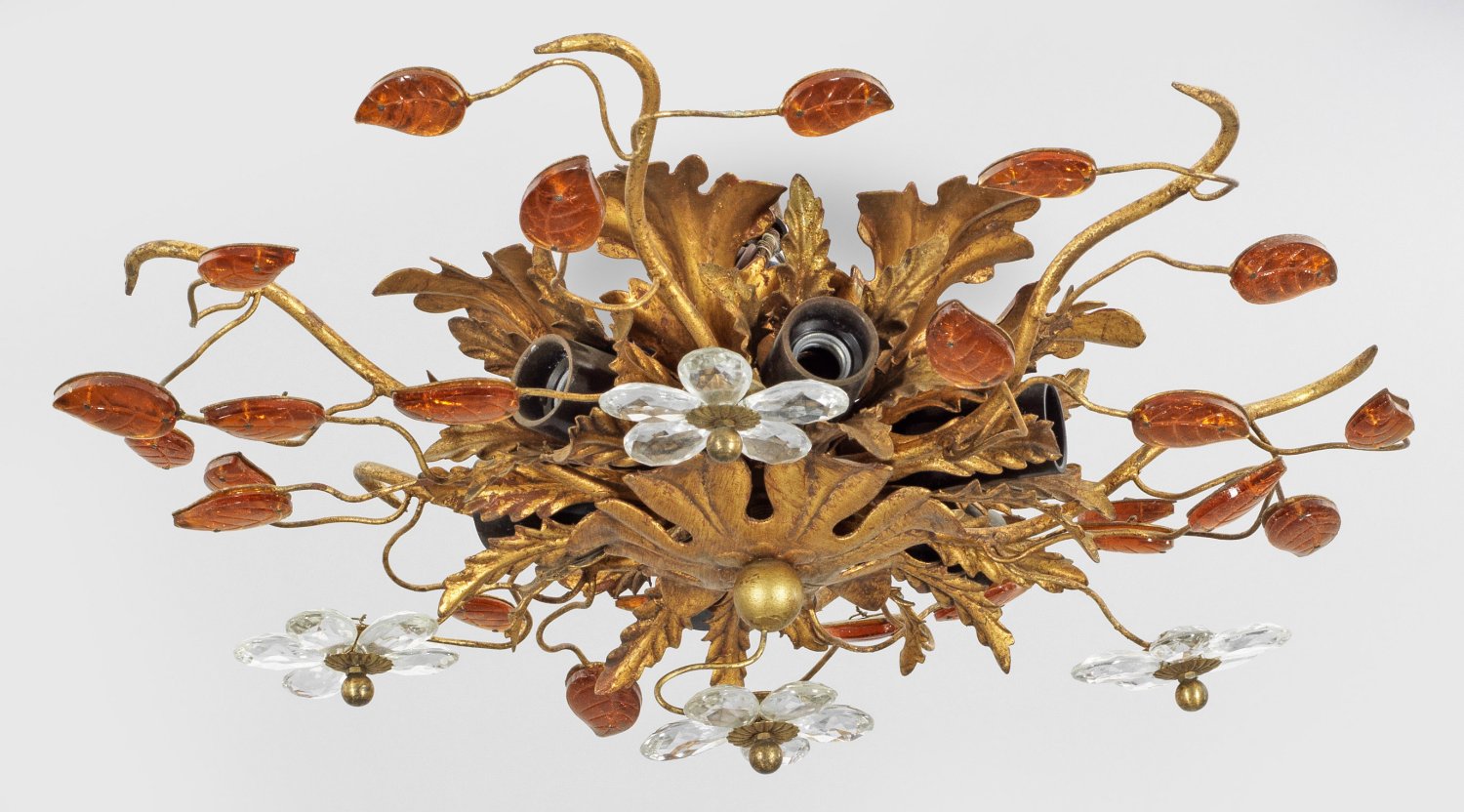 6-flg.; Metall, vergoldet sowie farbloses und kupferfarbenes Glas. Plafoniere aus üppigem Blattwerk als Träger für Leuchtmittel. Dekorationen aus schlanken Zweigen und Blüten. Elektrifiziert. Unbezeichnet. H. 15 cm. D. 42 cm
