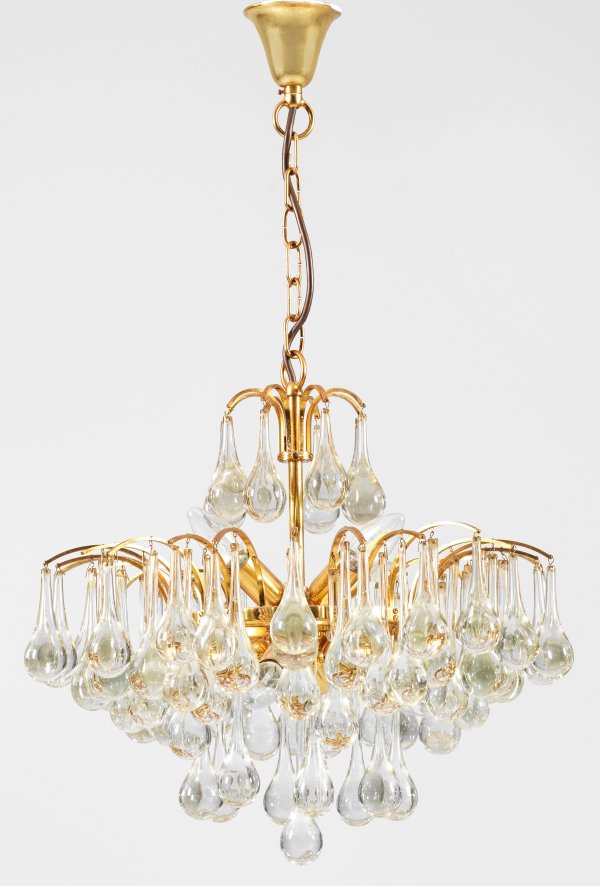 Messing und farbloses Muranoglas. Schmaler Schaft als Träger für acht Lampenfassungen sowie schmalen Reif mit stark gebogten Streben. Reicher Behang aus großen Tropfen. Kettenaufhängung. Elektrifiziert. Herstellerzeichen. Ges.-H. 78 cm. D. 48 cm.