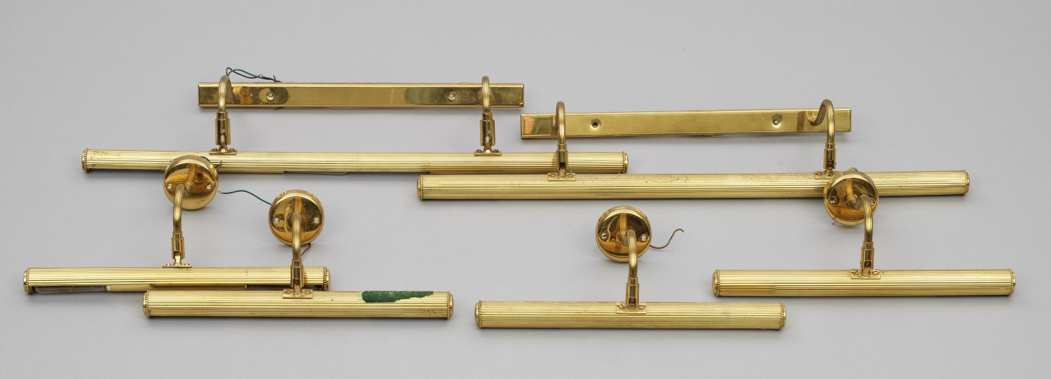 2- bzw. 4-flg.; Messing. Über rundem, bzw. gestrecktem Wandschild gebogte, godronierte Leuchterarme als Träger für korrespondierendes Leuchtmittel. Elektrifiziert. B. 37,5 cm bzw. 72,5 cm.