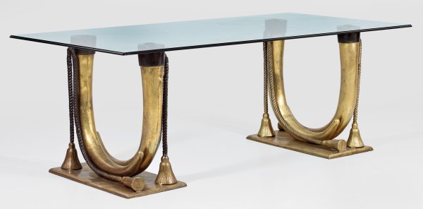 Bronze, teilw. dunkel patiniert und farbloses Glas. Über flacher, rechteckiger Sockelplatte gegeneinander gestellte Stoßzähne sowie dicke Kordeln mit Quastenabschlüssen. Oberhalb rechteckige Deckplatte. H. 78 cm. 220 cm x 110 cm.