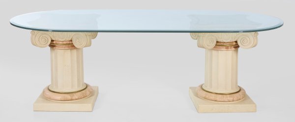 Cremefarbener sowie roséfarbener Guss in Marmoroptik und farbloses Glas. Über quadratischer Plinthe kannelierte Säulenschäfte mit ionischen Kapitellen als Träger für gerundete Deckplatte, minim. besch.; H. 73 cm. 228 cm x 109 cm.