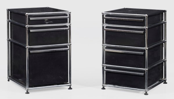 Metall, verchromt bzw. schwarz lackiert. Rechteckiger Korpus aus durch Kugelelemente verbundenen Rundstäben. In der gegliederten Front drei bzw. vier Schubladen unterschiedlicher Größe. H. 67,5 cm. 42 cm x 52 cm.