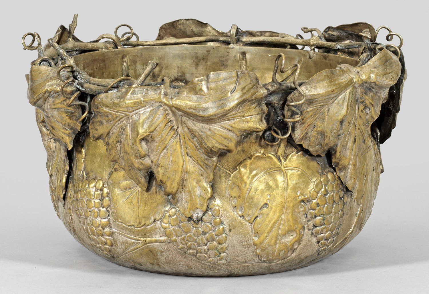 Messing, versilbert. Bombierter, sich leicht konisch weitender Korpus mit flächendeckendem Dekor aus reliefplastischen Weinreben. Umlaufend der Wandung plastische, naturalistisch gestaltete Weinranken. Herstellerzeichen. Einsatz fehlt. H. 24 cm. D. 43 cm.