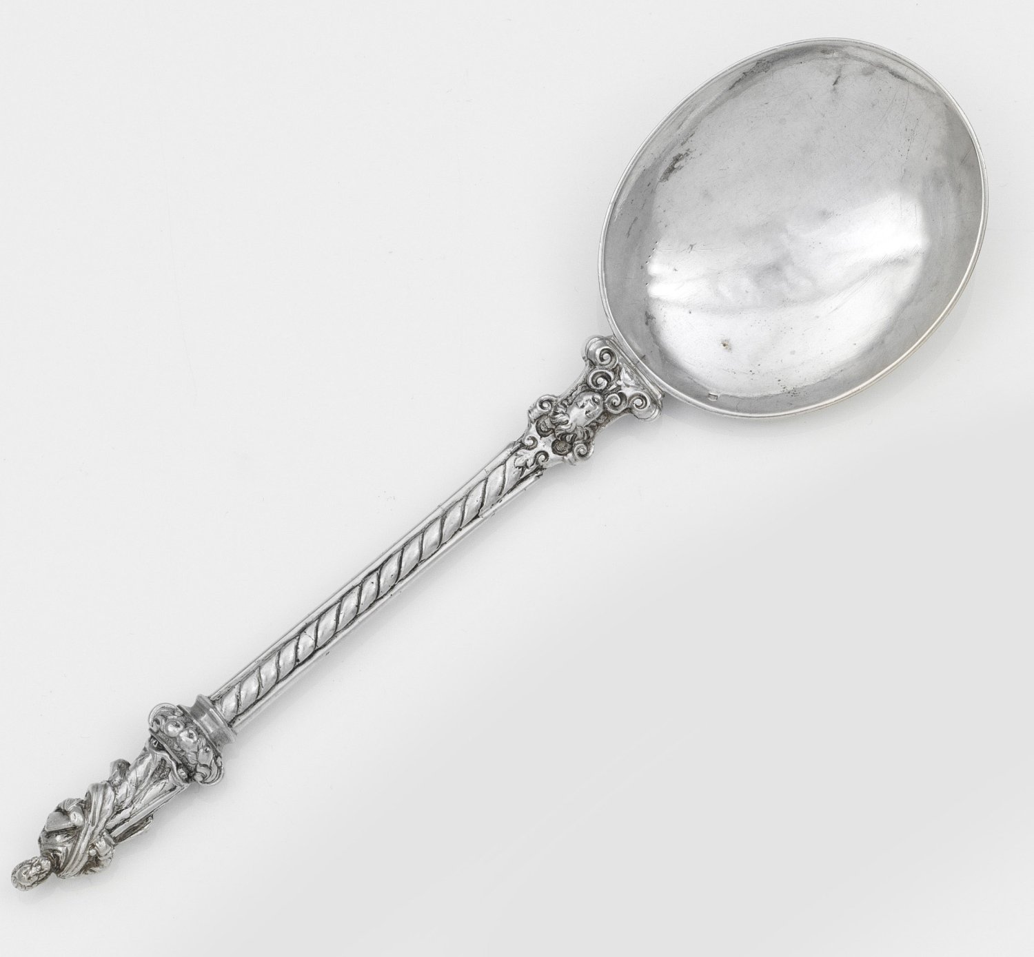 A German probably Gothic silver spoon with depiction of apostle Paulus. Monogrammed.