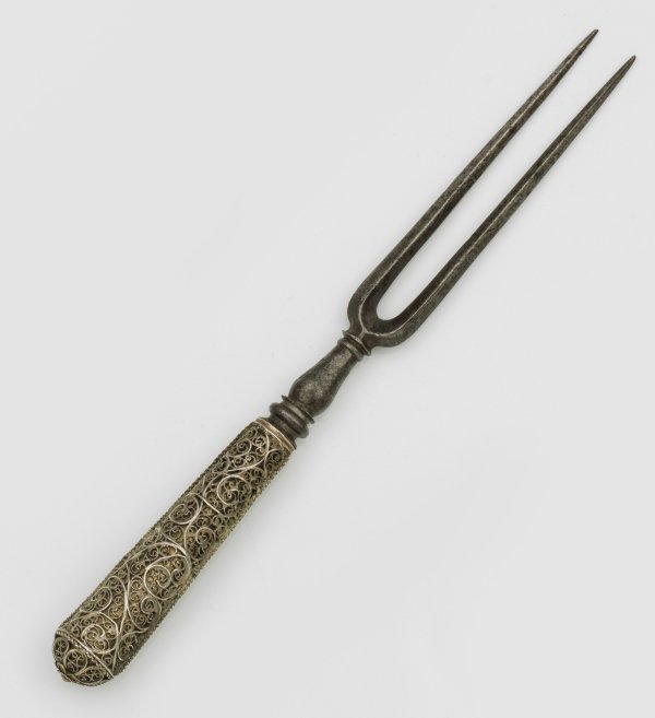 Stahl und Silberdraht. Zweizinkige Forke, übergehend in konischen, gerundeten Griff. Umlaufend zarter, durchbrochen gearbeiteter Rankendekor in sog. Silberfiligran-Technik mit zarter Blütenrosette verziert. L. 22,5 cm