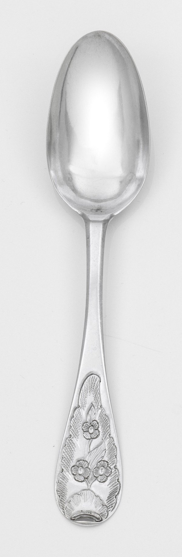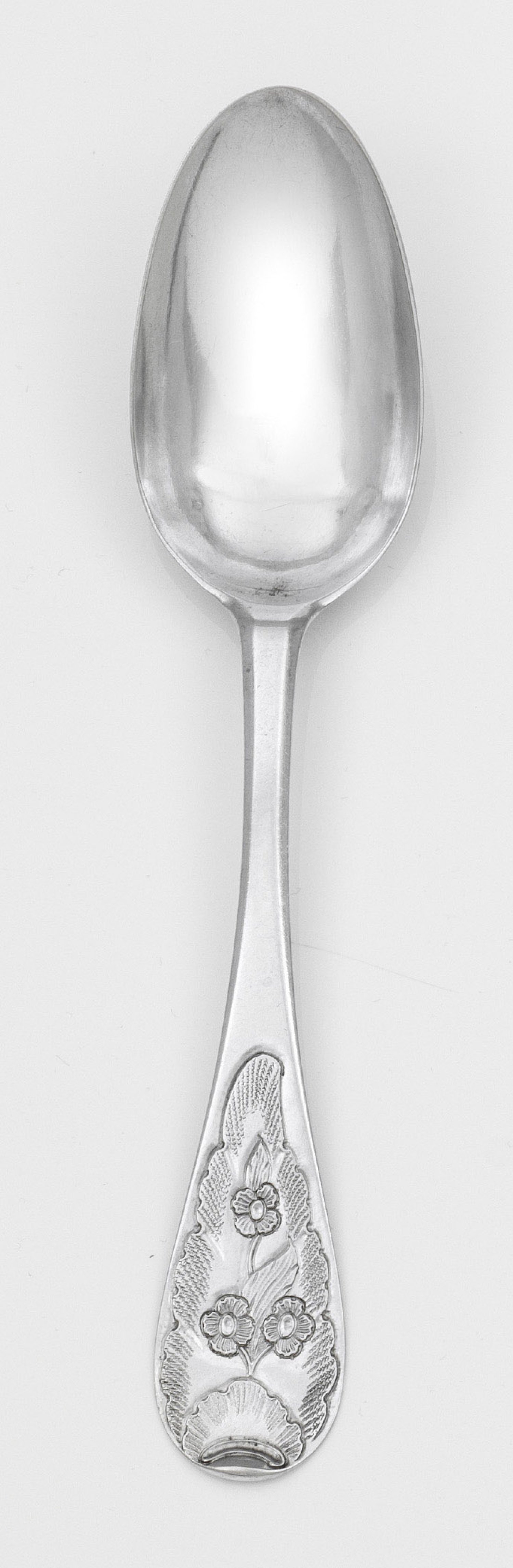 Silber. Ovale Laffe, übergehend in konischen Griff. Gerundetes Heft mit reliefierten Rocaillen und Blüten. Rückseite des Griffes mit Widmung "Christ. G. Tietzens Schützen Andencken. 1784". Gest., Tremolierstrich, Beschauzeichen, Meisterzeichen "K O". Gew. ca. 45 g. L. 20 cm.