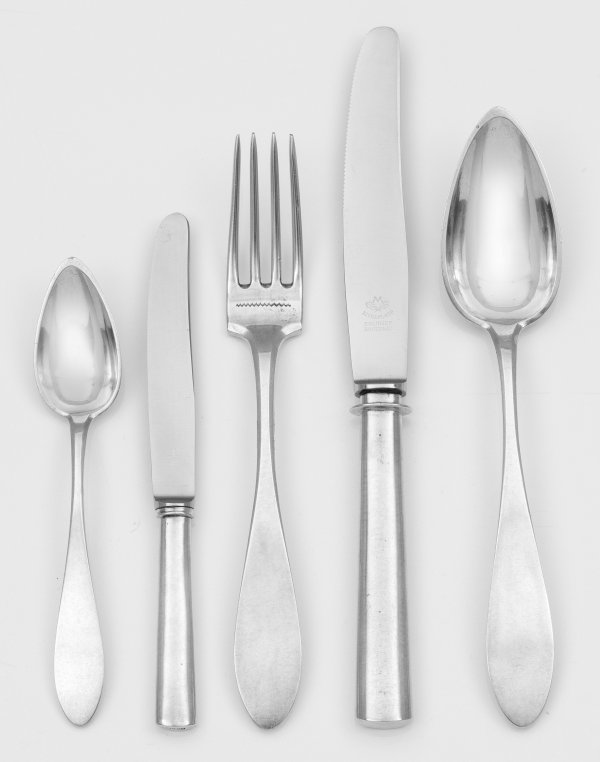 Silber. 51-tlg.; 12 Tafelmesser, 12 -gabeln, 12 -löffel, 9 Teelöffel, 6 Obstmesser. Sich konisch erweiternder Griff mit profiliertem Rand. Schneiden aus Edelstahl. Teilw. gest., Tremolierstrich, Hofjuwelier Johann Christian Sick (geb. 1766) und Eduard Foehr (tätig 1. Hälfte 19. Jh.). Erg. Edelstahlklingen. Gew. zus. ca. 3415 g (Gew. ohne gefüllte Teile ca. 2040 g).